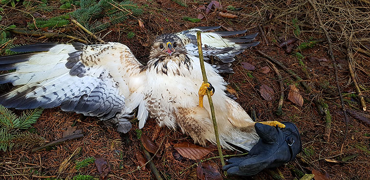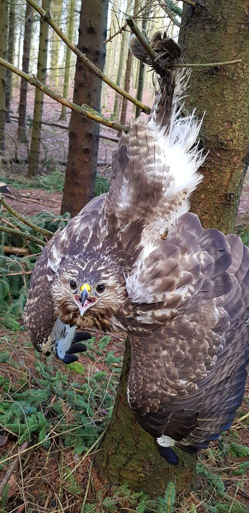 Am Baum hing ein Mäusebussard und klappte kopfüber mit weit ausgebreiteten Schwingen, deren Unterseite weiß leuchtete. Die Bewegungen waren langsam und kraftlos, als ob er da schon recht lang gehangen hätte. Vermutlich war er unterkühlt. Seine Schwanzfedern waren mit irgendeiner Substanz verklebt. Und vielleicht hatte er Kopfschmerzen vom Verkehrtrumhängen.