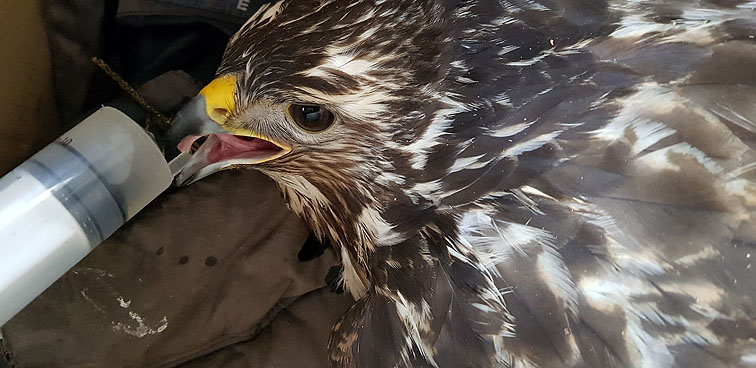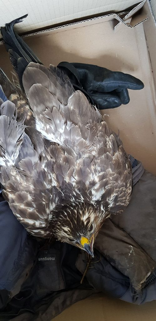 Ich rief Barbara an, die (natürlich) wusste, was zu tun war: Ich solle das Tier mit meiner Jacke einwickeln und mitnehmen. Sie gab mir auch die Nummer von B., einem örtlichen Tierarzt, Jäger und Wildvogelbeauftragten, der versprach umgehend vorbei zu schauen.