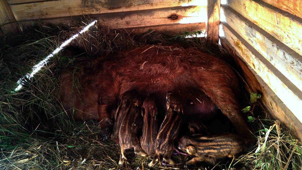 Inzwischen hatten wir von einem Eber in Sternthal ganz in der Nähe gehört. Frau H. war sofort einverstanden, als Decktaxe vereinbarten wir eins der Ferkel. Kurzerhand packten wir Paula in einen offenen Hänger und fuhren ins Nachbardorf. Paula und der ebenfalls noch recht junge Keiler – es stellte sich heraus, dass der Liebhaber zu 50% Wildschweingene trug – begrüßten sich mit Naserubbeln und Herumjagen, es war Liebe auf den ersten Blick, und diesmal klappte es auch mit dem Nachwuchs. Um sicher zu gehen ließen wir Paula 6 Wochen bei ihm. Drei Monate später baute Paula aus Zweigen und Gras ein Nest, und eines Morgens krabbelten 8 gestreifte Ferkel übereinander. In den ersten Stunden versuchten sie noch, sich im Heu zu verstecken und den Körperkontakt mit Mama nicht zu verlieren, aber es dauerte nicht lang und sie krabbelten im Schweinepferch herum und erforschten alle Winkel.