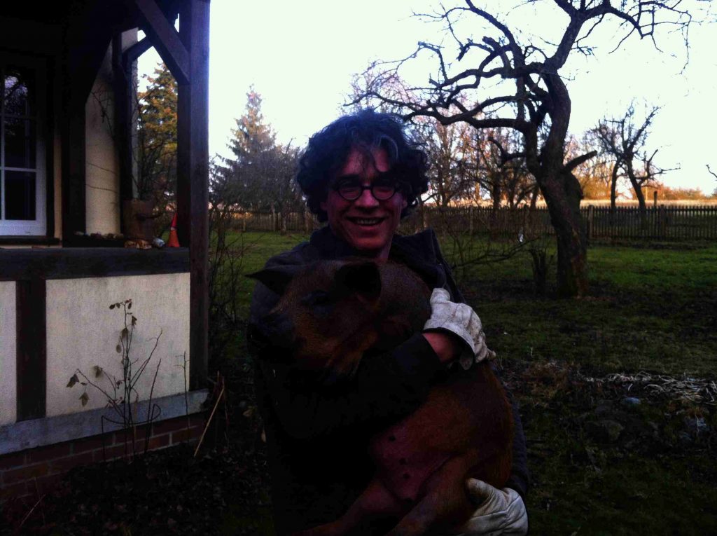 Tom und ich sahen uns an. Wir hatten nicht erwartet, dass der Moment des Tötens so unspektakulär sein könnte. Peng. Vorbei: Peters Sehnsüchte, sein Charakter, seine Geschichte, seine Eigenheiten, seine Individualität – da war so viel Leben, so viele Erinnerungen…. und jetzt gab es das alles nur noch in meinem Kopf. Die Morgen im Herbst, wenn er verschlafen aus dem Stroh kroch, uns sah und mit Paula um die Wette zum Trog rannte. Das vorwurfsvolle Grunzen, wenn wir uns mit dem Füttern verspäteten. Das begeisterte Lachen in seinem Schweinegesicht, wenn er nach den glitzernden Wassertropfen der Dusche schnappte. Das hektische Hin- und Herlaufen, wenn er versuchte herauszufinden, was er tun musste um das fettig glänzende Croissant in meiner Hand zu bekommen. Alles vorbei. Wir hatten es beendet. Vielleicht gab es noch eine unsichtbare Seele, die vom Organismus losgelöst weiter existierte, aber zumindest ich ging davon nicht aus.